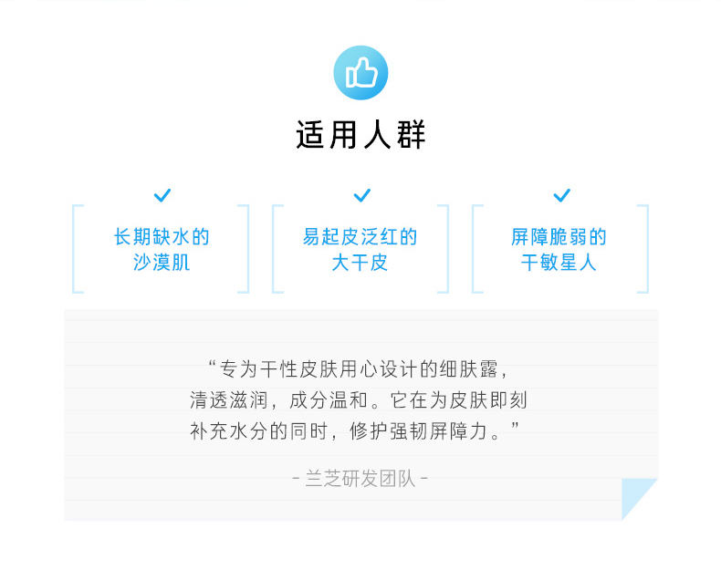 兰芝水衡透润细肤露是一款水润型细肤露,为干燥肌肤补充满满水润。兰芝矿物质水为肌肤及时地补充水分,泛醇和常温提取未破坏成分的菖蒲提取物为肌肤补充水分和营养,打造紧实润泽肌肤。